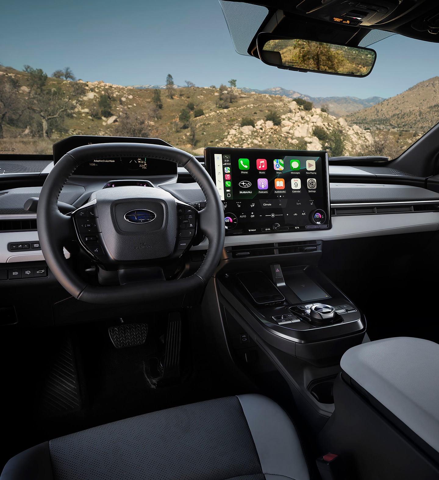 Every Solterra includes Subaru's comprehensive suite of safety technologies. Standard features include blind-spot monitoring, lane-departure warning, dynamic radar cruise control, and collision mitigation systems. The 14-inch multimedia touchscreen runs Subaru's latest infotainment system with wireless Apple CarPlay and Android Auto connectivity, cloud-based navigation, and Over-The-Air updates.