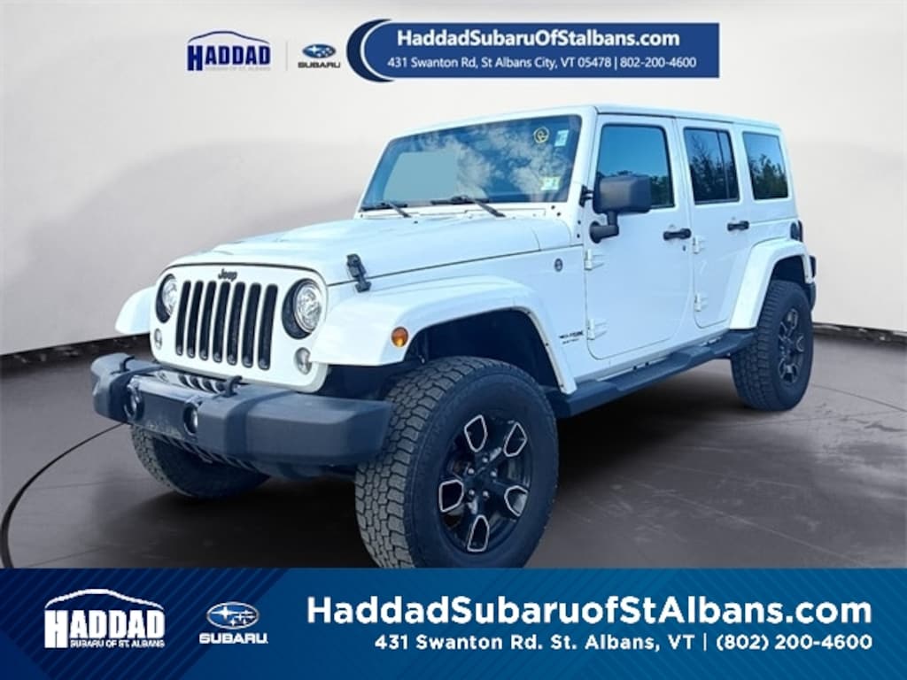 HADDAD SUBARU OF ST. ALBANS 431 SWANTON ROAD ST. ALBANS, VT 05478 802-200-4600 The selling price of the vehicle is market price plus the dealer documentation fee of $599, and the title fee of $42.00 that dealers may charge to procure the certificate of title. This vehicle may have an open recall. The dealer will make all reasonable attempts to clear this recall. If parts or non-remedy repairs are not available there may be a continued claim to monitor. This Vehicle features Altitude Package, Quick Order Package 23L Altitude (Black/Chrome Screws Fuel Filler Door, Body Color 3-Piece Hard Top, Body Color Grille w/Black Accents, Delete Sahara Badge, Diesel Gray Accent Stitching, Gloss Black Rear Fascia Applique, Glossy Black Jeep Badge, Heated Front Seats, Hood w/Power Bulge, Leather Trimmed Seats, Liquid Titanium Accents, Low Gloss Wrangler JK Decal, Millennium Fabric Sport Bar Cover, MOPAR Black Tail Lamp Guards, MOPAR Grab Handles, and Wheels: 18" x 7.5" High Gloss Black Polished), 18" x 7.5" Polished Satin Carbon Wheels, 3.21 Rear Axle Ratio, 4-Wheel Disc Brakes, 40GB Hard Drive w/28GB Available, 5-Year SiriusXM Travel Link Service, 6.5" Touchscreen Display, 8 Speakers, ABS brakes, Air Conditioning, Alloy wheels, Alpine 9-Speaker w/All Weather Subwoofer, AM/FM radio: SiriusXM, Audio Jack Input for Mobile Devices, Auto-dimming Rear-View mirror, Brake assist, CD player, Cloth Seats w/Adjustable Head Restraints, Compass, Driver door bin, Driver Height Adjuster Seat, Driver vanity mirror, Dual front impact airbags, Electronic Stability Control, Freedom Top Hard Top Headliner, Front anti-roll bar, Front Bucket Seats, Front Center Armrest w/Storage, Front fog lights, Front reading lights, Front Seat Back Map Pockets, Fully automatic headlights, GPS Navigation, Heated door mirrors, Heavy Duty Suspension w/Gas Shocks, Illuminated entry, Integrated roll-over protection, Leather steering wheel, Low tire pressure warning, MOPAR Slush Mats, Occupant sensing airbag, Outside temperature display, Panic alarm, Passenger door bin, Passenger vanity mirror, Power door mirrors, Power steering, Power windows, R1234YF A/C Refrigerant, Radio data system, Radio: 130, Radio: 430 Nav, Rear anti-roll bar, Remote keyless entry, Remote USB Port, Security system, SiriusXM Travel Link, Speed control, Split folding rear seat, Steering wheel mounted audio controls, Sunrider Soft Top, Supplemental Front Seat Side Airbags, Tachometer, Tilt steering wheel, Traction control, Trip computer, and Variably intermittent wipers.